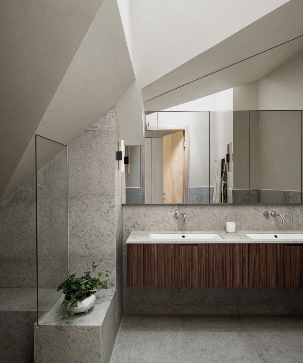 Breite, massive Eichendielen von Dinesen betonen die Geräumigkeit und die Sichtachsen der Wohnung. Unser Kalkstein, Lindanäs gebürstet, verkleidet sowohl den Boden als auch die Wände in beiden Bädern. Die Taktilität und das Aussehen des gebürsteten Steins verstärken das natürliche Gefühl. Alle Tischlerarbeiten wurden von der Tischlerei Retsloff nach Maß entworfen und vor Ort gebaut. Hergestellt aus massivem Walnussholz.